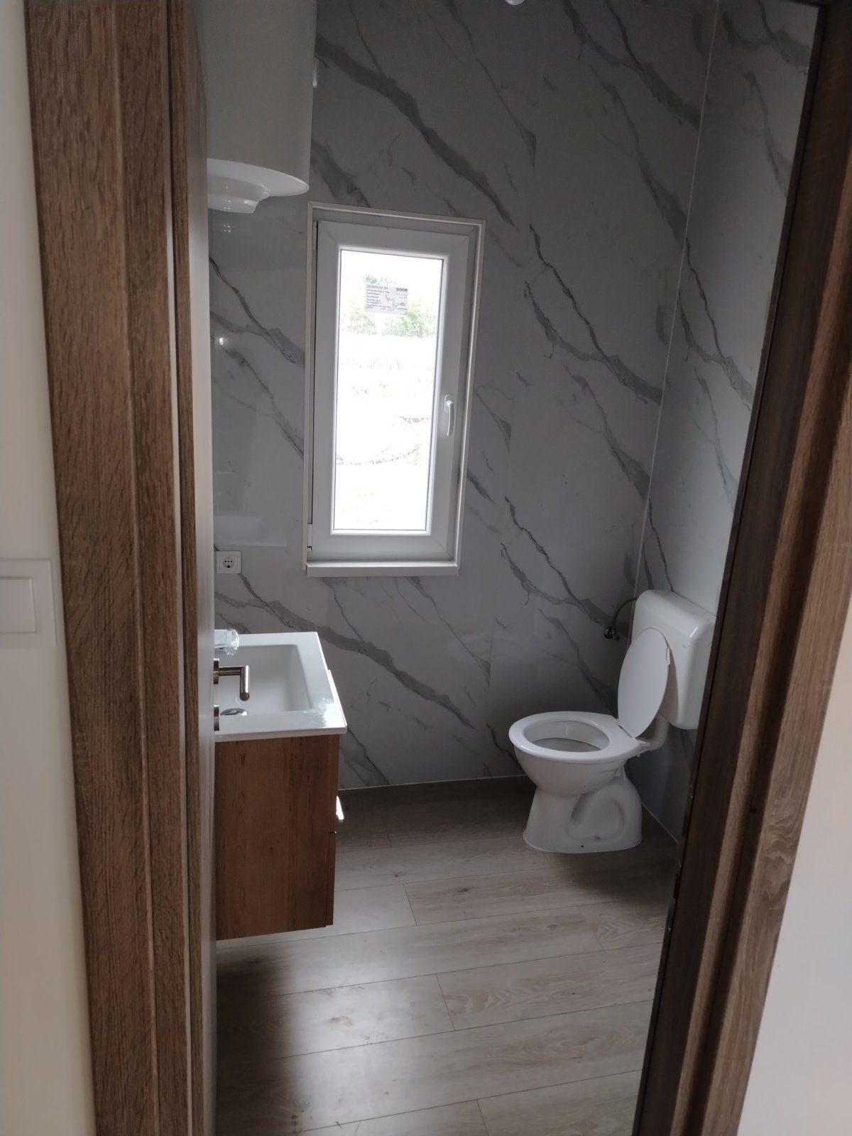Fürdő felszereltség: mosdó + szekrény, 50 l melegvíz-tároló, WC, mosógép kiállás, 80×80 cm zuhanykabin
